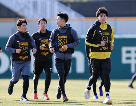 阪神の新人合同自主トレーニングが7日、兵庫県尼崎市の日鉄鋼板SGLスタジアム尼崎で始まり、ドラフト1位の立石正広内野手(右端)ら7選手(育成2人含む)がキャッチボールやランニングなどで汗を流した。 【時事通信社】