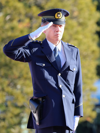 警視庁は9日朝、東京都新宿区の明治神宮外苑絵画館前で年頭部隊出動訓練を行った。迫田裕治警視総監(写真)が見守る中、約1250人の警察官と約130台の車両などが参加した。 【時事通信社】
