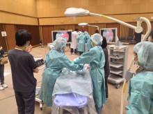 県支部ゾーンでは、心肺蘇生法やAEDの体験、救護服やナース服、白衣に着替えて記念撮影できるコーナーを展開。病院ゾーンでは子どもたちが医師指導の下、「電気メス体験」「手術縫合体験」「模擬手術体験」に挑戦した。