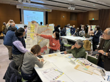 その後のワークショップでは、参加者が地域ごとに4人~9人の班に分かれ、防災行動計画「マイタイムライン」を作成。地図で仮に設定した自宅を確認し、ハザードマップを基に災害リスクを整理した。その後それぞれ出された住居の種類や家族構成などの条件を踏まえ、時間の経過とともに変化する大雨情報に応じた行動を話し合った。各班の代表者が他の班を回って意見を共有し、班内で振り返りを行った。
