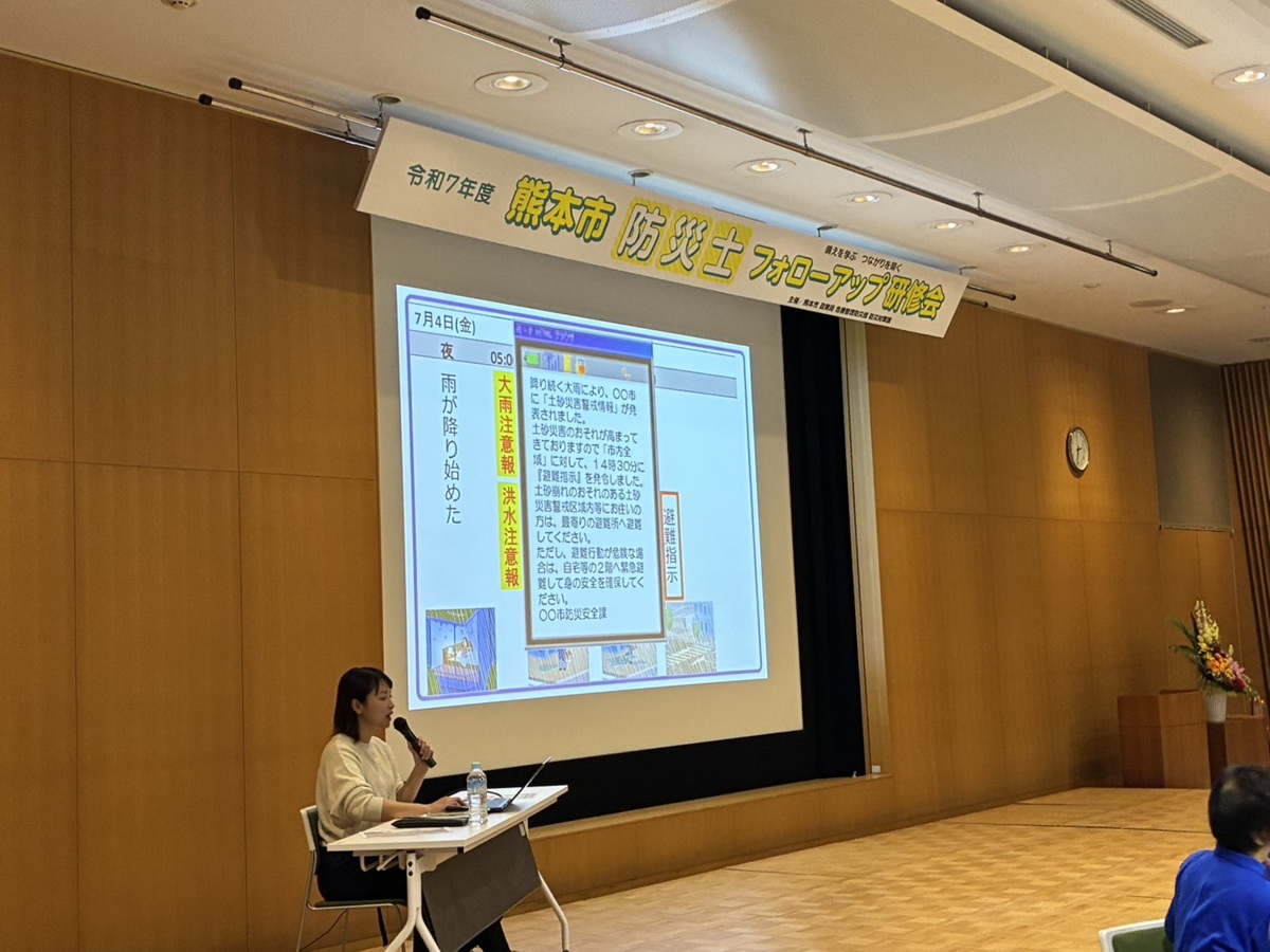 研修は2部構成。第1部では、同部防災対策課の職員が「地域防災リーダー」制度について紹介。地域防災リーダーに登録すると、該当する地域団体からの協力要請を受けて熊本市から連絡が入るという流れが説明された。このほか、熊本地震10年関連の取り組みとして、「支えられた日々を、支え合う力に」をコンセプトに掲げた事業や、車中泊避難に関する実証実験などの事例も紹介した。