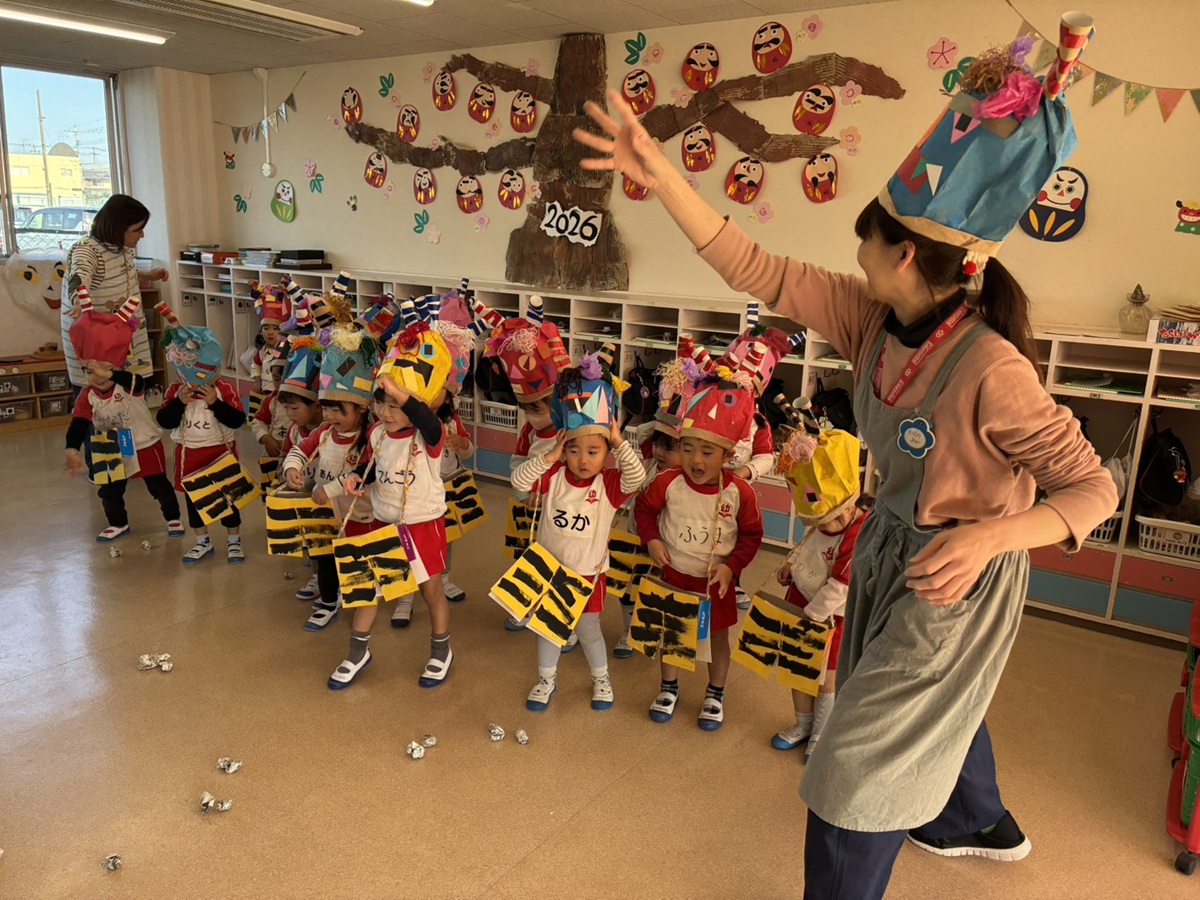 節分に合わせた豆まき行事が2月3日、東海大学付属かもめ幼稚園(熊本市中央区帯山7)で行われた。