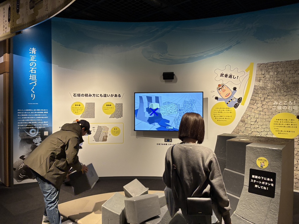 「清正の石垣づくり」コーナーで石垣の復元に挑戦する来館者